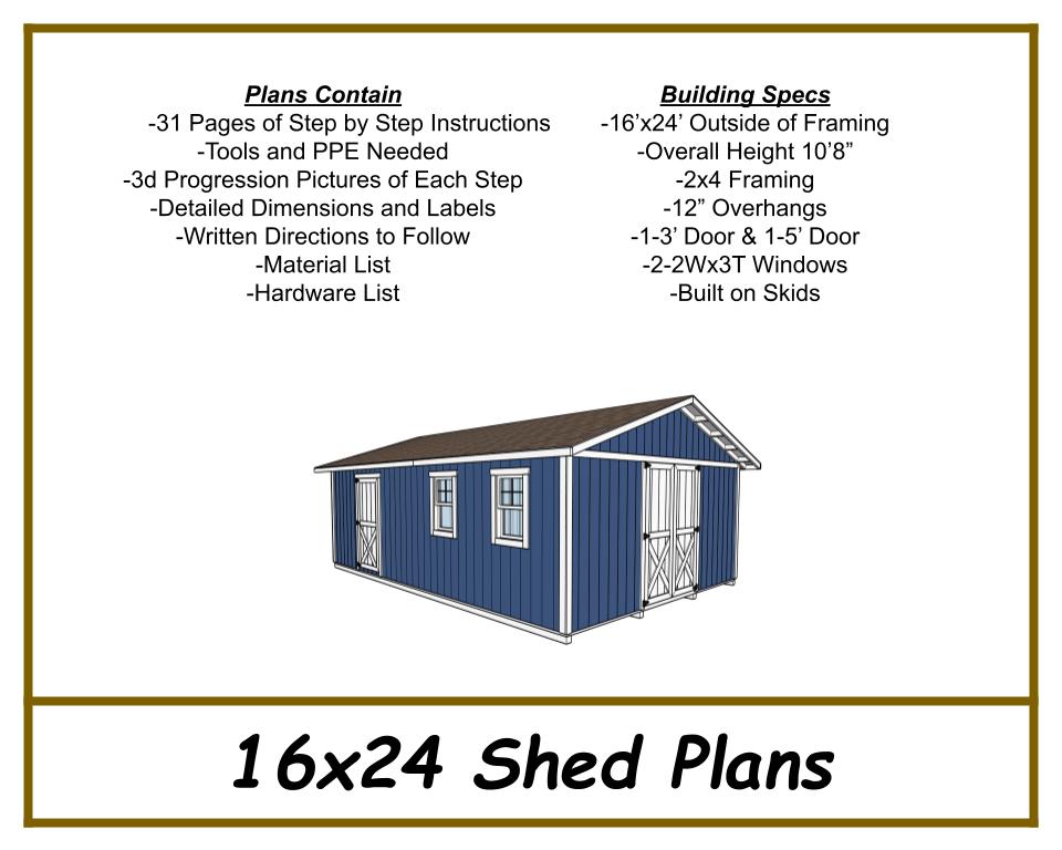 Make building your own 16x24 shed simple with these easy to follow step by step instructions that include a complete material list with all hardware, lumber, and materials needed. All drawings have measurements, directions, and 2D and 3D images that are easy to follow. This is a large shed and is recommended to have some construction skill and knowledge to complete.